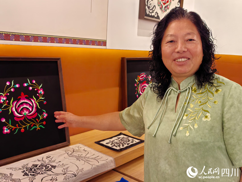 潘貴蘭介紹她以石榴為主題的刺繡作品。人民網記者 劉海天攝
