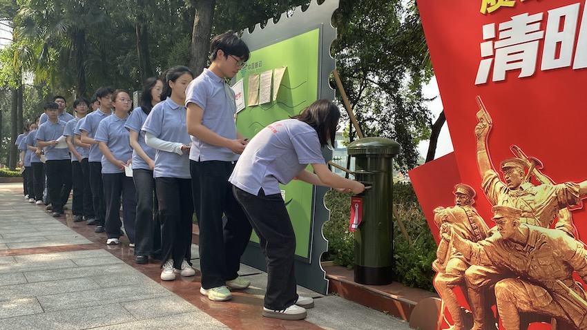 字里行間,是年輕一代與英烈的精神對話?;顒悠陂g,自貢全市12處烈士紀念設施設置“時空郵筒”,設置新兵“出征軍令狀”、退役軍人“戰友,我想對你說”、學生“致烈士的一封信”等主題,邀請社會各界以書信形式“對話英烈”。讓思政教育從“說教式”向“體驗式”升級。當地還通過組織預定新兵、退役士兵與學生結對,共同參與清明祭掃、書信寄英烈等活動,讓“瞬間感動”化為“長效浸潤”。
