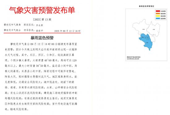 目前,攀枝花市氣象臺暴雨藍色預警生效中;攀枝花市仁和區、鹽邊縣暴雨藍色預警信號,涼山州德昌縣暴雨黃色預警信號,涼山州鹽源縣暴雨橙色預警信號生效中。