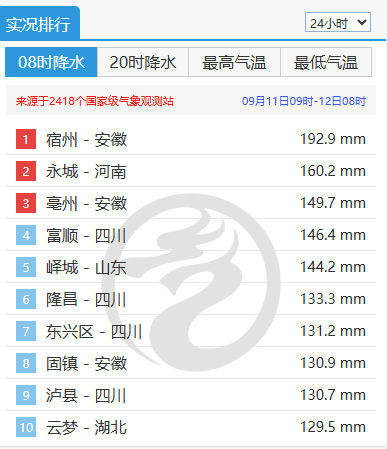 據中央氣象臺,9月11日9時至12日8時,全國2418個國家級氣象觀測站中,四川的富順、隆昌、東興區、瀘縣4個站點實況降水量躋身全國排行榜前十位,分別名列由多到少的第4、6、7、9位。