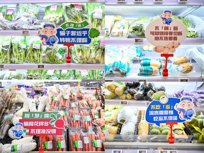 在蘇寧易購廣場盒馬鮮生超市,“網安趣集市”成為購物人群關注焦點?!啊焕怼覆恕埂_子裝熟人 轉賬不理睬’,這個諧音梗太好記了,拍給家里老人一看就懂!”市民張女士指著“網安宣傳牌”說道?;顒淤u場緊扣網絡詐騙、謠言傳播等網絡風險,創新推出融入生活場景與瓜果蔬菜元素的提示牌,將抽象的網絡安全知識轉化為通俗生活語言,實現“網安知識裝進菜籃子,安全意識入人心”。