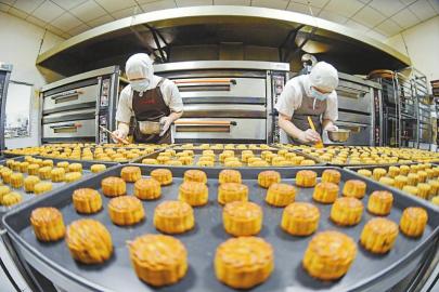 9月15日,成都市新津區保利得糕點坊生產車間內,工作人員正為傳統手工月餅刷涂蛋液。隨著中秋節臨近,保利得糕點坊啟動全線生產,工人們加班加點趕制訂單,全力保障節日市場供應。今年,該店代表性傳統手工月餅提前熱銷。月餅制作歷經30余道工序、推出20多種風味,在傳承經典的同時創新選用特色食材制作,受到消費者歡迎。 (四川日報全媒體記者 李向雨 攝)