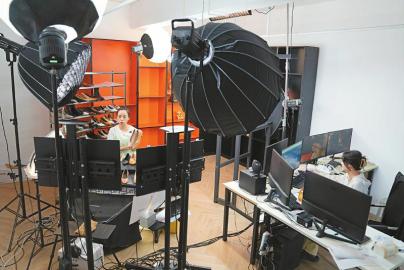 跟隨葉龍的腳步,我們來到該公司位于匯都時尚產業園3樓的店鋪內。和想象中不同,這里既是企業研發設計現場,也是電商直播現場,不見傳統展陳銷售場景。一眼望去,所有在售款式和剛剛上市的新品,都在10多個直播間里扎堆擺放。