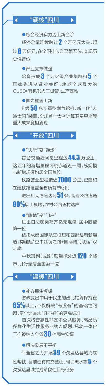 發布會拿出數據進行詮釋??唇洕偭?,這五年四川連續跨過2個萬億元大關、超過6萬億元,在全國排位升至第五位、實現歷史性晉位,綜合經濟實力邁上新臺階??串a業支撐,培育形成3個萬億級產業集群和5個國家先進制造業集群,建成全球最大的OLED(有機發光二極管)生產基地,F級50兆瓦重型燃氣輪機、新一代“人造太陽”裝置、全球首個太空計算衛星星座等重大成果競相涌現,“四川造”國之重器不斷增添新成員。