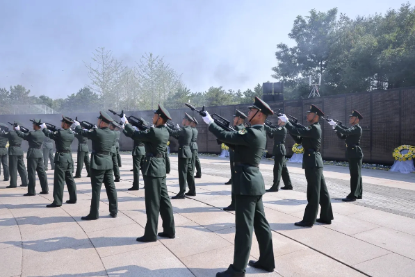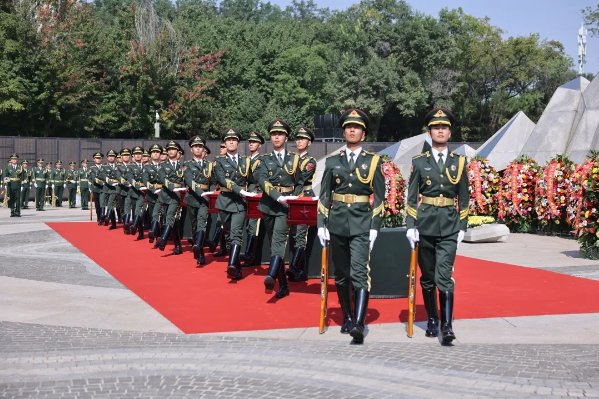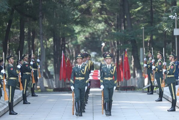 祖國和人民始終沒有忘記先烈們的歷史功勛,隆重舉行安葬儀式就是對先烈們的深切緬懷和莊嚴紀念。陵園下沉式紀念廣場環形烈士英名墻下擺滿了黃白相間的菊花,參加儀式的人們肅穆站立。上午10時,儀式正式開始,軍樂隊奏響婉轉低回的《思念曲》,在解放軍儀仗司禮大隊官兵持槍護衛下,禮兵們邁著整齊的步伐,護送志愿軍烈士遺骸棺槨緩步進入紀念廣場,全場奏唱中華人民共和國國歌。裴金佳致祭文后,全體人員向志愿軍烈士遺骸三鞠躬。27名禮兵連續鳴槍12響,向志愿軍烈士致以崇高敬意。