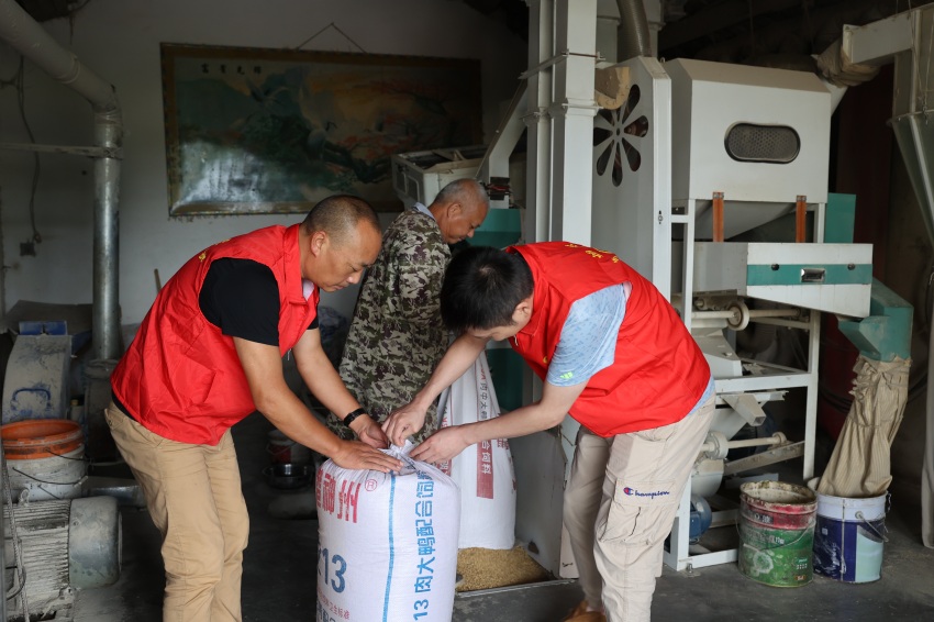 黨員志愿者協助進行水稻代加工。楊千依供圖