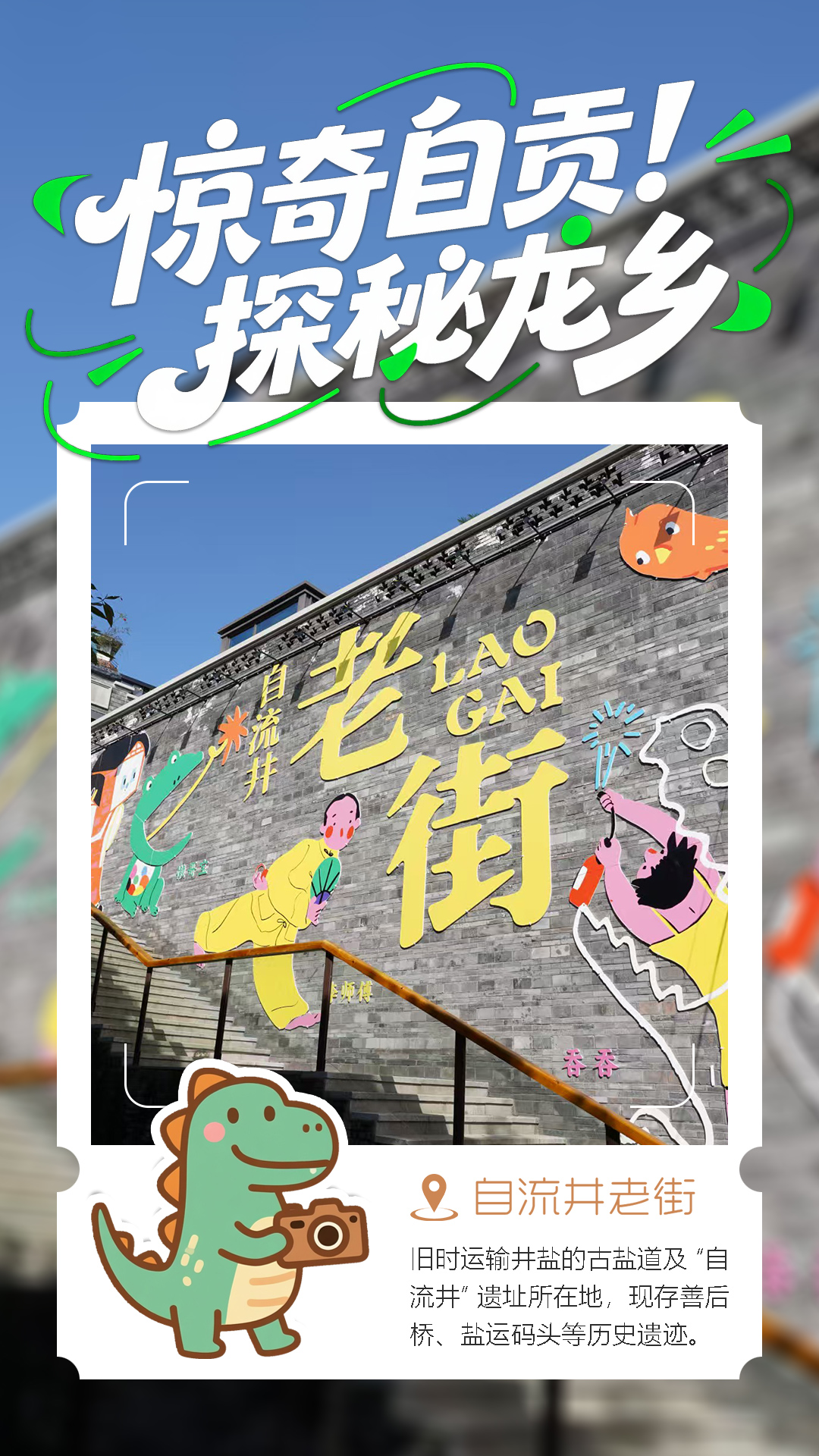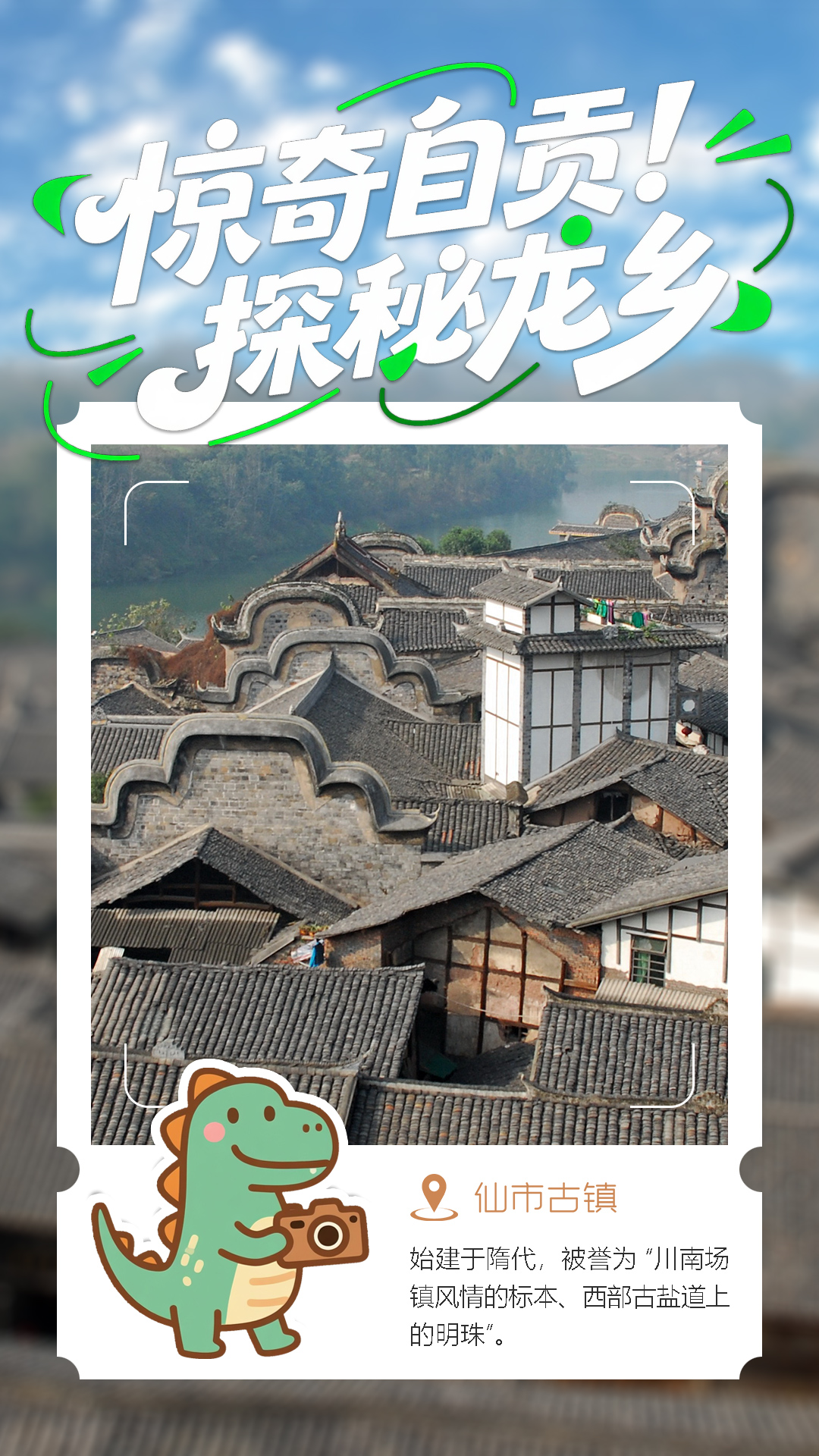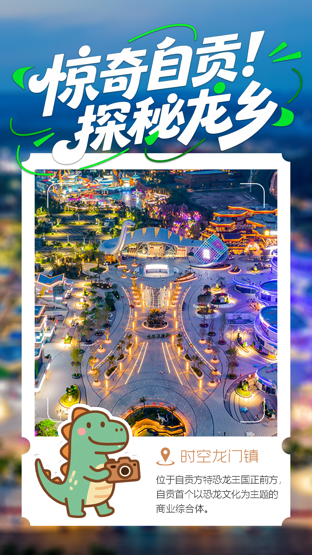 時空龍門鎮:與自貢方特恐龍王國、自貢恐龍博物館形成“一館一園一鎮”的自貢恐龍文化旅游核心景區,可就近打卡自貢方特恐龍王國、大山鋪吃兔一條街、龍藝街口袋公園。