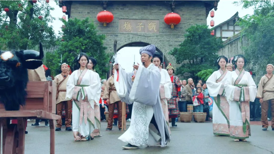 每天清晨,隨著渾厚的號角聲響起,身著三國服飾的儀仗隊從古鎮牌坊列隊而行。在陣陣鑼鼓聲中,“諸葛孔明”站在大鼓上吟誦洛帶賦文,隨著一聲鏗鏘的鼓點,挑夫扁擔舞、客家對山歌、漢舞快閃輪番上演。身著古裝的商家們應聲拉開鋪門吆喝叫賣,客家龍舞隊員擎著彩龍在人群中穿梭翻騰,游客循著“三國成街”的劇情線索前行,仿佛踏入千年之前的熱鬧市集。