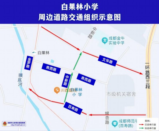 三、2025年10月20日起,工作日每天17:20—17:50(寒暑假期除外)對金牛區白果林小學周邊的中新路(百壽路至文華路)實施機動車由南向北單向通行的交通管理措施。受限機動車可通過百壽路、文華路、金羅路、青西路、銀杏路等道路繞行。