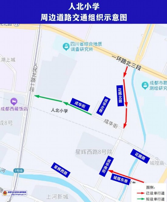 二、2025年10月20日起,工作日每天17:00—17:40(寒暑假期除外)對金牛區人北小學周邊的成華街(成華北巷至人民北路)實施機動車由東向西單向通行的交通管理措施。受限機動車可通過星輝西路、成華南街、人民北路一段等道路繞行。