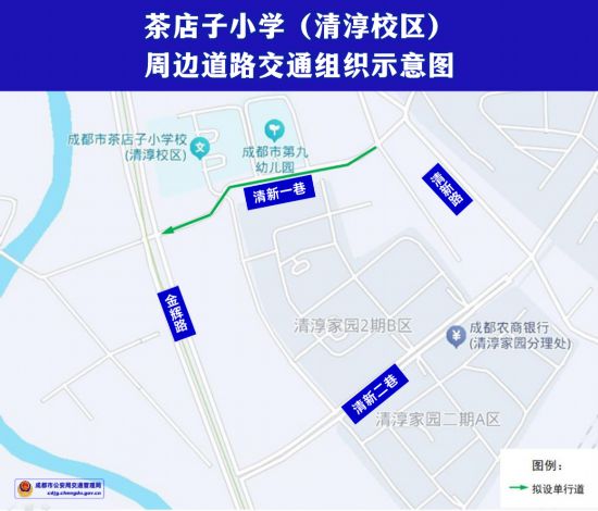 五、2025年10月20日起,工作日每天7:50—8:30;17:20—18:00(寒暑假期除外)對金牛區茶店子小學周邊的清新一巷(金輝路至清新路)實施機動車由北向南單向通行的交通管理措施。受限機動車可通過金輝路、清新二巷、兩河路、清新路等道路繞行。