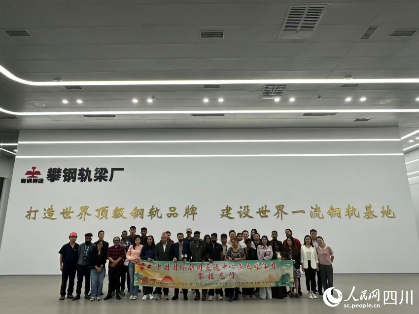 亞太媒體記者團成員在攀鋼集團軌梁廠展覽館合影留念。實習生 張雨欣攝