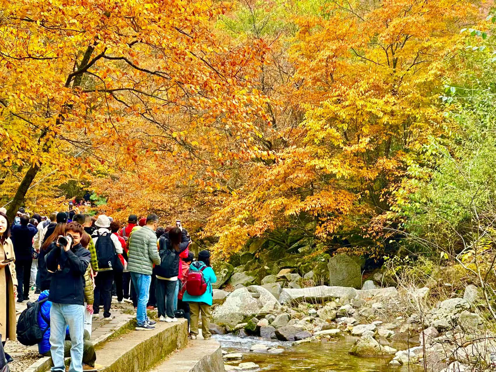 黑熊溝的美,不在山勢的險峻,而在于其溪瀑潭石與五彩林木的完美相融。順溝行,滿眼的紅葉,與周圍巨石、樹木相映成趣。小瀑如練,羞澀奔涌,為幽谷添一份靈動,恍若步入斑斕童話。金黃與火紅,青苔與碧水交織,構成一幅色彩飽和的光霧油畫。路旁,幾位漢服姑娘正拍照,紅葉落于云肩,宛如從南龕石窟走出的“媚態觀音圖”。