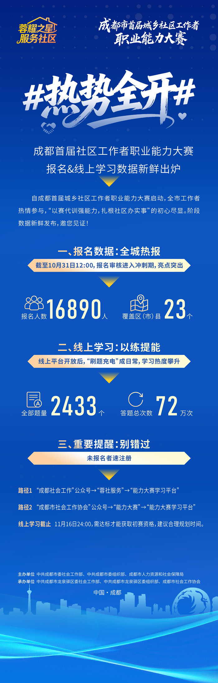 本次大賽作為加強社區工作者隊伍建設的重要實踐,自啟動以來引發全市城鄉社區工作者熱烈響應。截至10月31日,報名總人數突破16890人、答題總次數突破72萬次,覆蓋全市23個區(市)縣,展現出社區工作者“以賽代訓強能力,扎根社區辦實事”的高漲熱情。