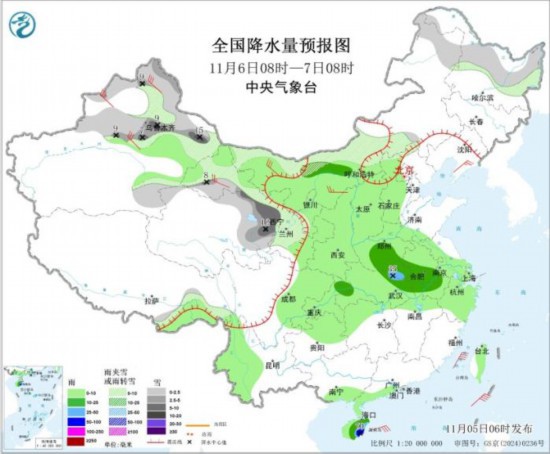 11月6日8時至7日8時,新疆北部和東部、青海東部、甘肅中西部、內蒙古中西部和東北部、黑龍江中北部、河北西北部等地部分地區有小到中雪或雨夾雪,其中,新疆沿天山地區、青海東北部、甘肅河西等地部分地區有大到暴雪(10~15毫米),新增積雪2~8厘米,局地10厘米以上。內蒙古河套地區、河南中南部、湖北東北部、安徽中部、重慶東北部、海南島中東部等地部分地區有中到大雨,其中,海南島東南部局地有暴雨(50~70毫米)。新疆北部和東部、甘肅河西、內蒙古中西部、遼東半島地部分地區有4~6級風;南海西南部海域有9~11級風、陣風11~12級,南海中西部海域有7~9級風、陣風10級。